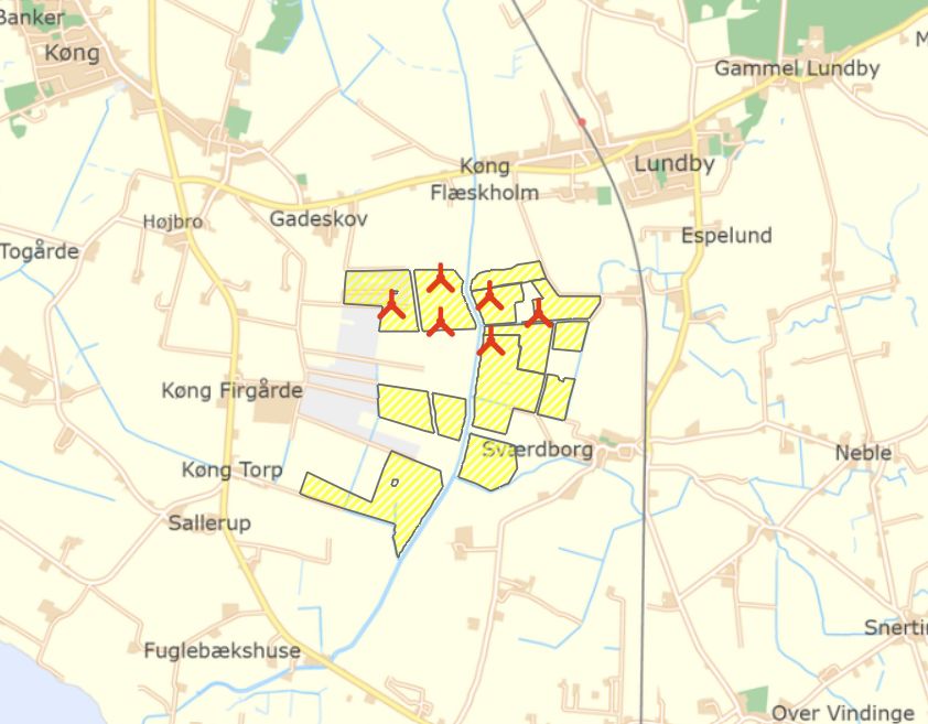 Projektområdet er placeret mellem byerne Lundby, Køng og Sværdborg. Der står i forvejen 10 ældre vindmøller med en totalhøjde på 51 meter i området, disse vindmøller vil blive nedtaget, hvis projektet realiseres.