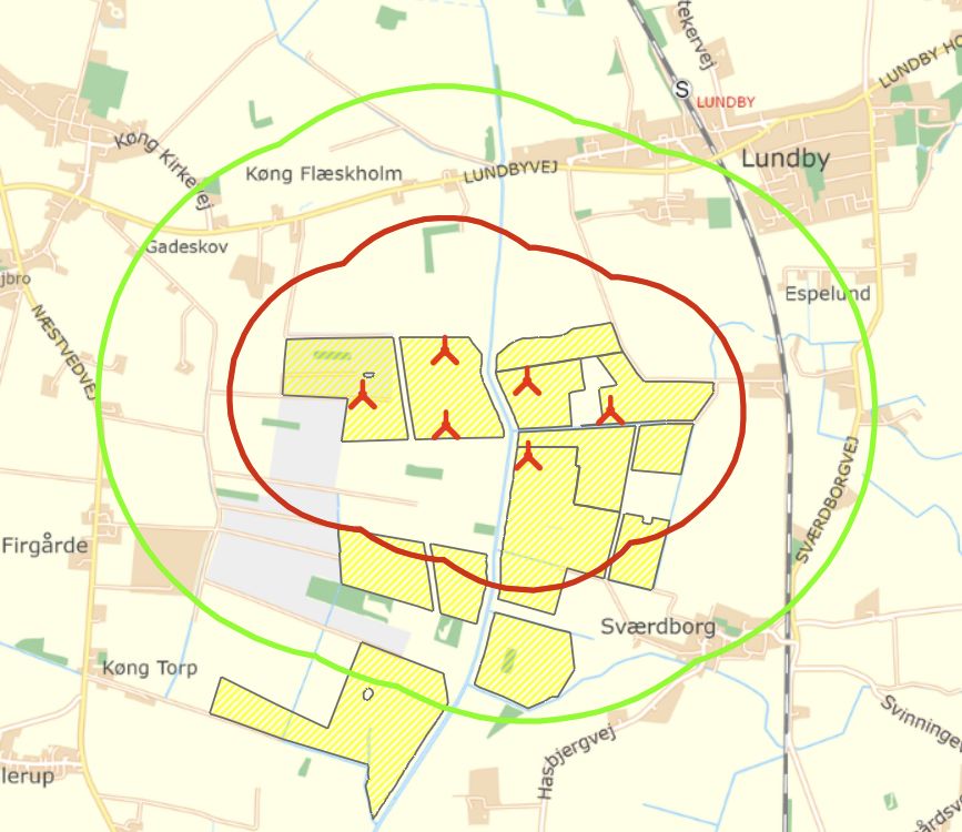 Boligen der ligger indenfor den grønne og røde linje, kan søge om VE-bonus. - ingen boliger indenfor 200 meter fra solceller